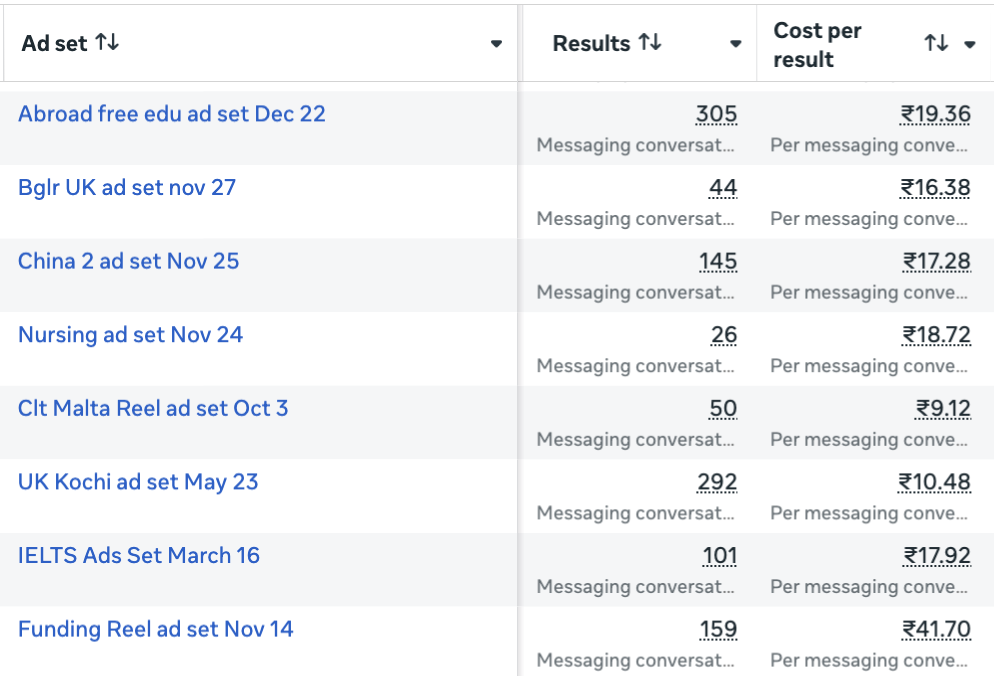 Scalable Strategy: Demonstrated the ability to manage multiple concurrent ad sets, optimizing for both specific regions (e.g., Karnataka, Kerela) and specific services (e.g., IELTS Ads).