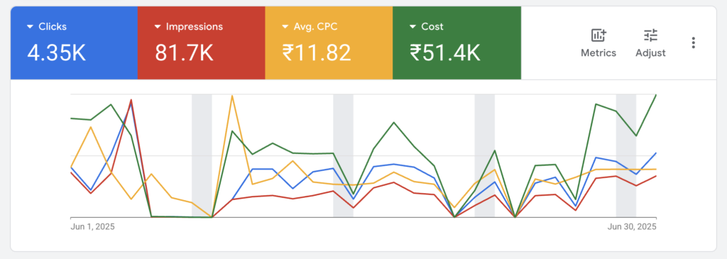 Average CPC of ₹11.82: In the competitive Study Abroad or Education niche, getting targeted traffic for under ₹12 is impressive. It shows your keywords are highly relevant and Quality Score is likely high.
